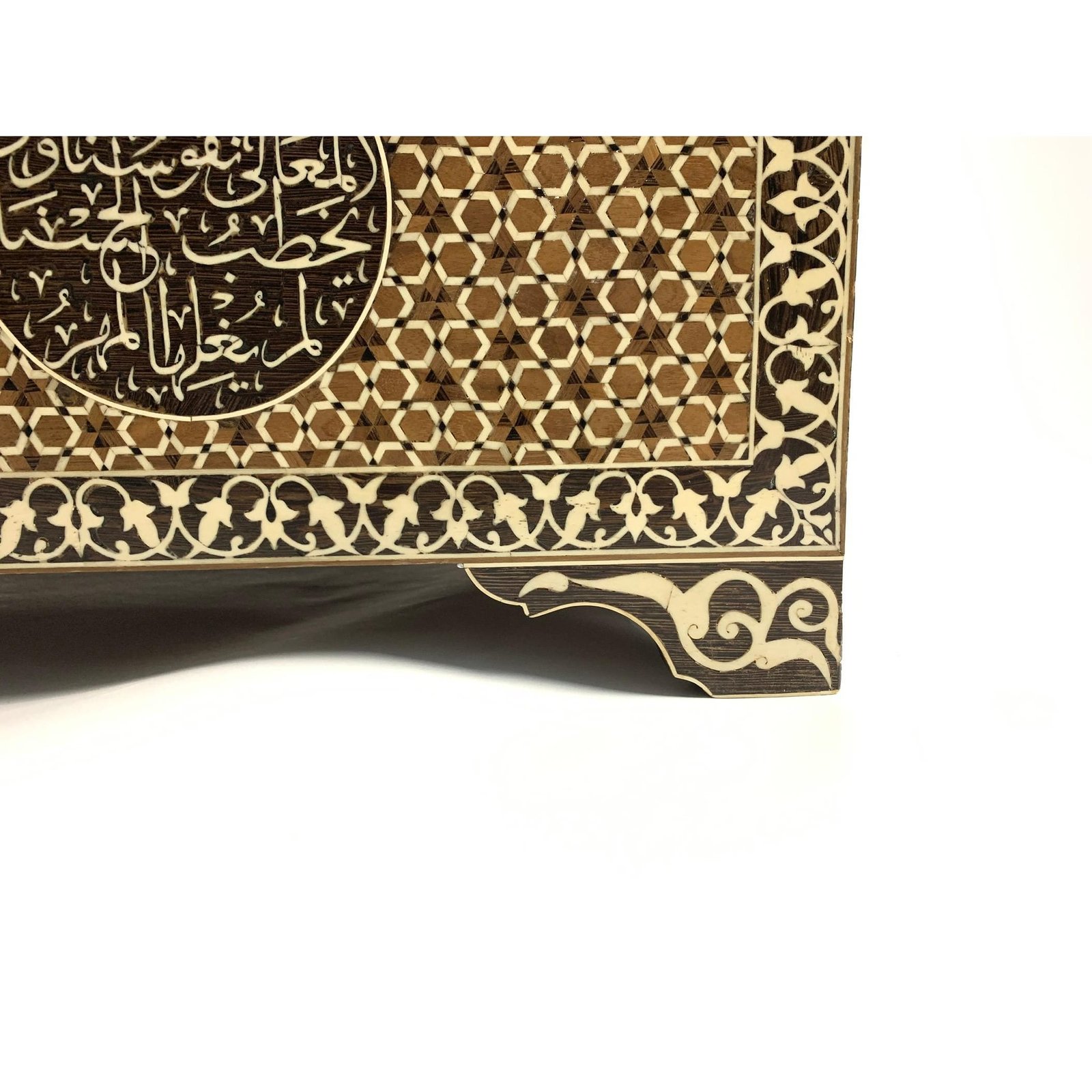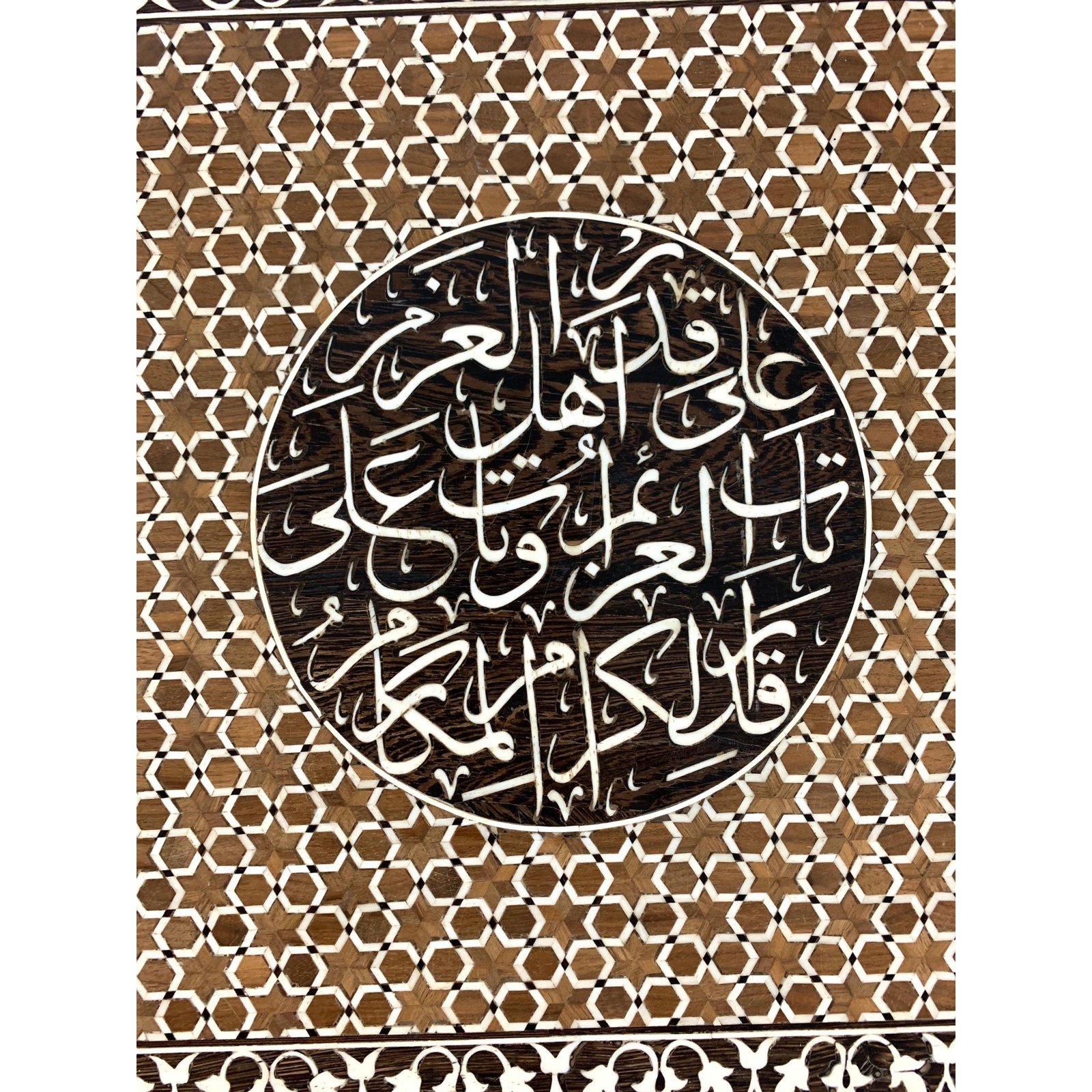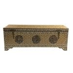 An early 20th century wooden blanket chest with bone inlay. This lovely blanket chest captures our attention with its rich geometrical decoration. The chest is topped with a rectangular lid, opening to reveal a nice storage compartment. It is the out side of the chest however that steals the show with its delicate bone inlay forming a geometric motifs and Islamic inscriptions (Versus from the Quran).
